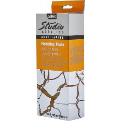 Le Modeling Paste Effet Craquelé s’utilise en 2 temps : - Préparation du support : Application de la phase 1 au pinceau en fine couche pour augmenter l’adhérence du Modeling et favoriser les craquelures. Laisser sécher (15 minutes environ). - Effet craquelé : Appliquer la phase 2 de consistance pâteuse à l’aide d’un couteau à peindre sur la phase 1 sèche. La phase 2 peut être appliquée seule, ou en mélange avec les couleurs Studio Acrylics (75% Modeling / 25% couleur). Au plus l’épaisseur de la phase 2 est importante, au plus il y aura de craquelures. Le temps de séchage peut varier de 1h à 3h selon l’épaisseur déposée